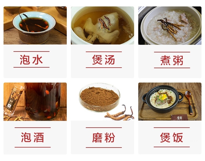 我推荐的就是泡水喝,水喝完后虫草别忘了吃。然后就是煲汤,最后就是打成粉冲水喝,味道有点像板蓝根,有些人装在胶里,这样出差吃方便。有些朋友喜欢用虫草泡酒喝,少量饮酒对身体也是有好处的,虫草酒虽好,可不要贪杯哦